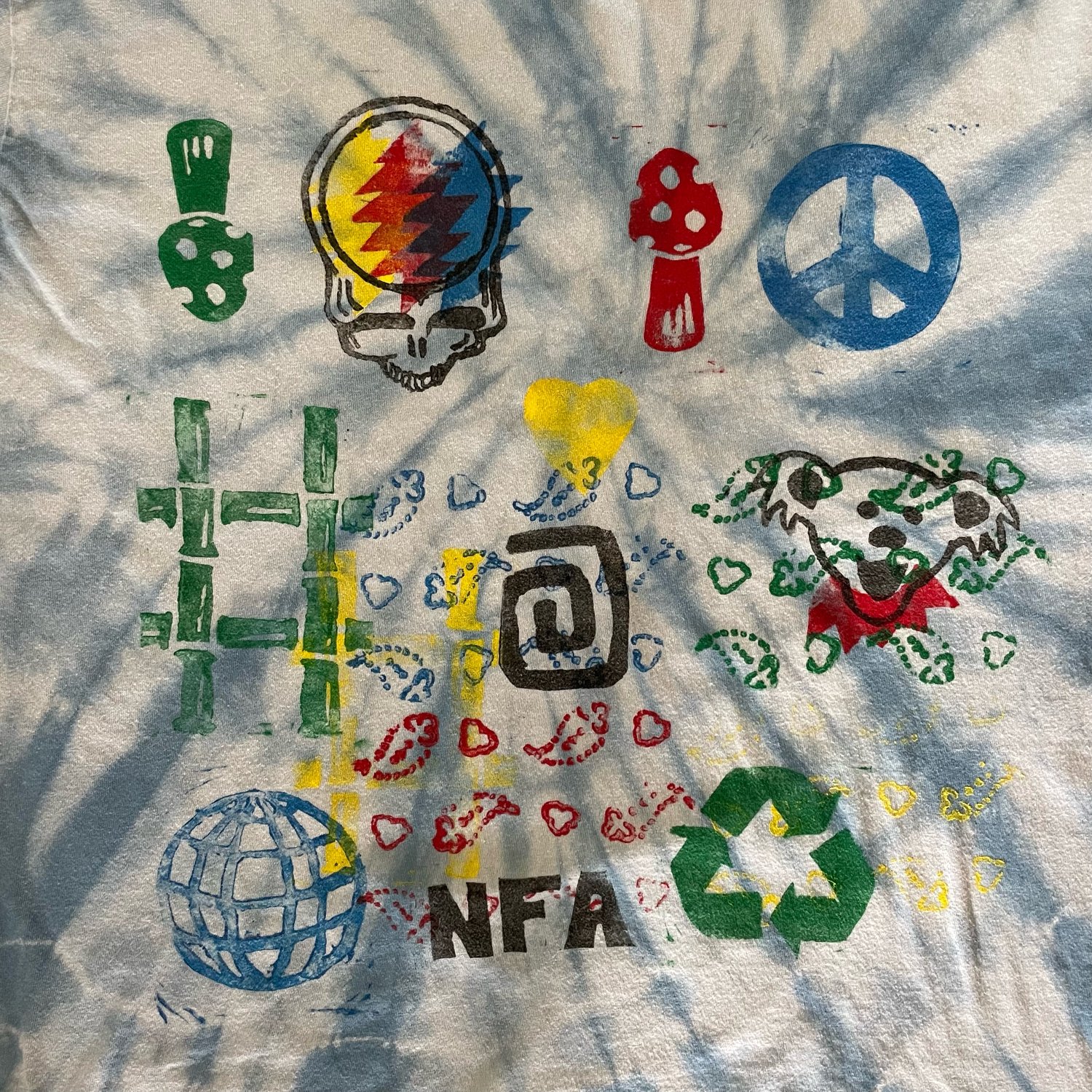 This particularly hand-made shirt was created over the course of a week with careful attention paid at every step. One day for tyeing and indigo dyeing. One to logo print the reverse. Then one day for each of the five colors on the front, followed by curing and washing out.