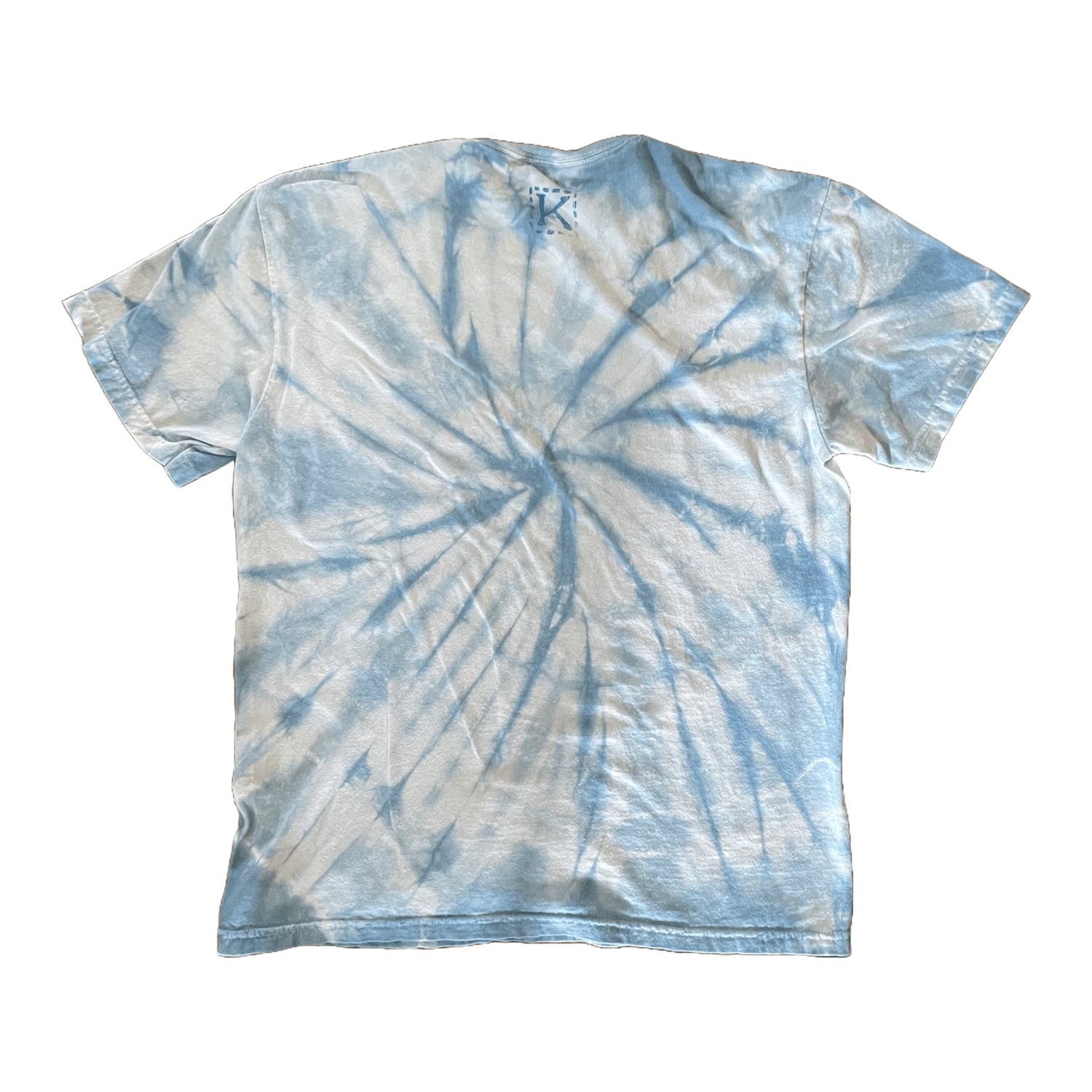A unique composition of hand-carved block prints, individually placed on a Large Comfort Colors tee lovingly spiral dyed in a vat of natural indigo.