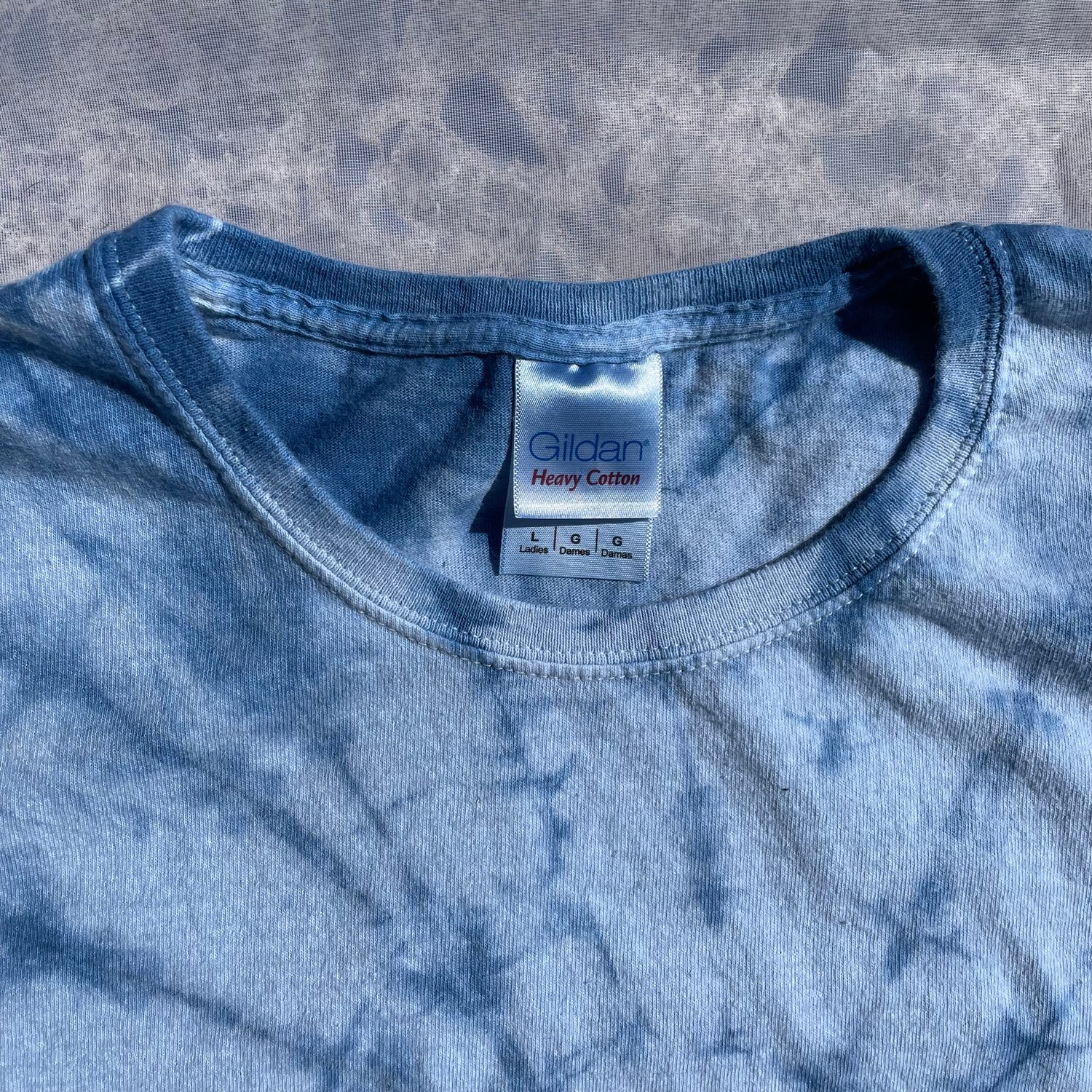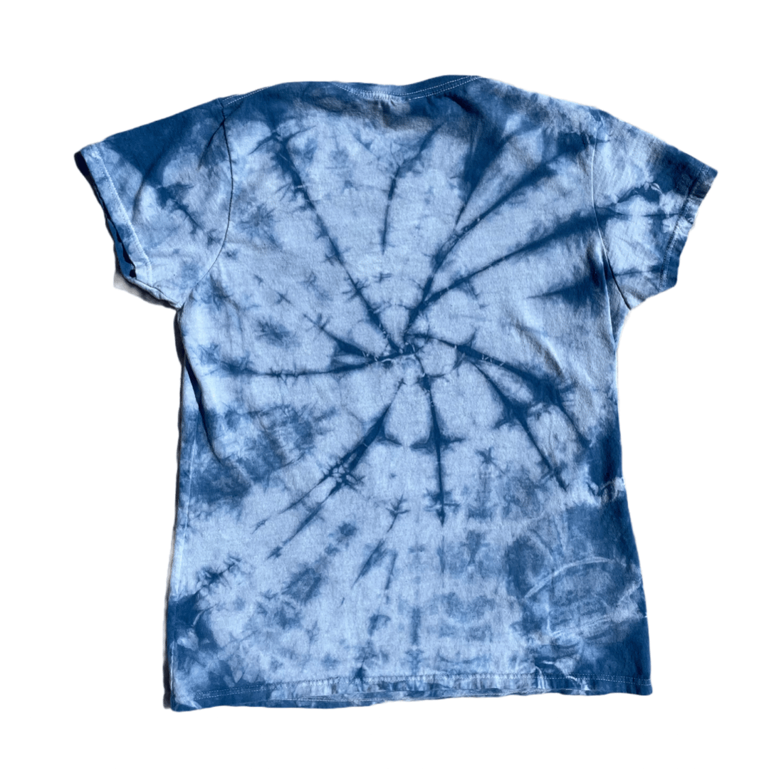 Tagged Women's Large. Hand-dyed spiral in natural indigo on a Gildan blank.