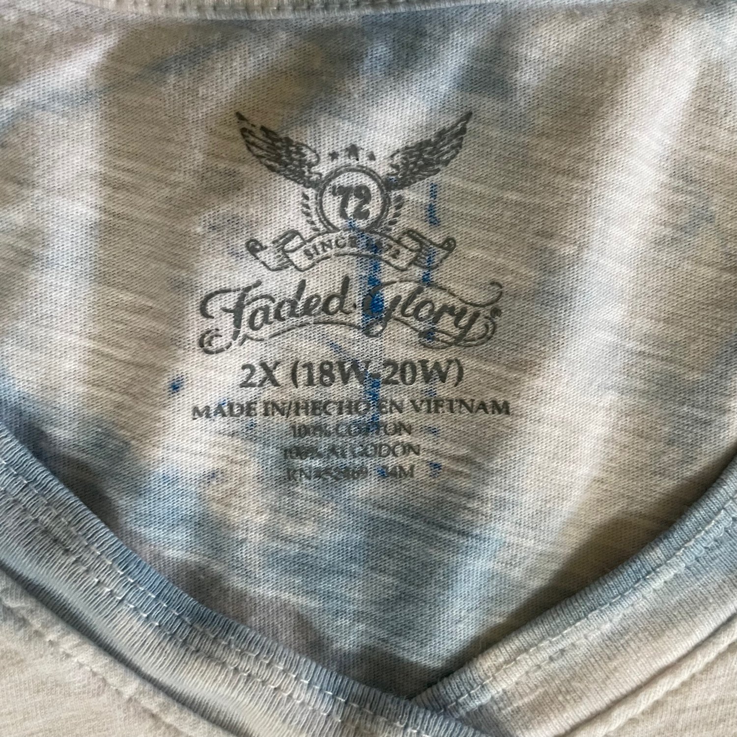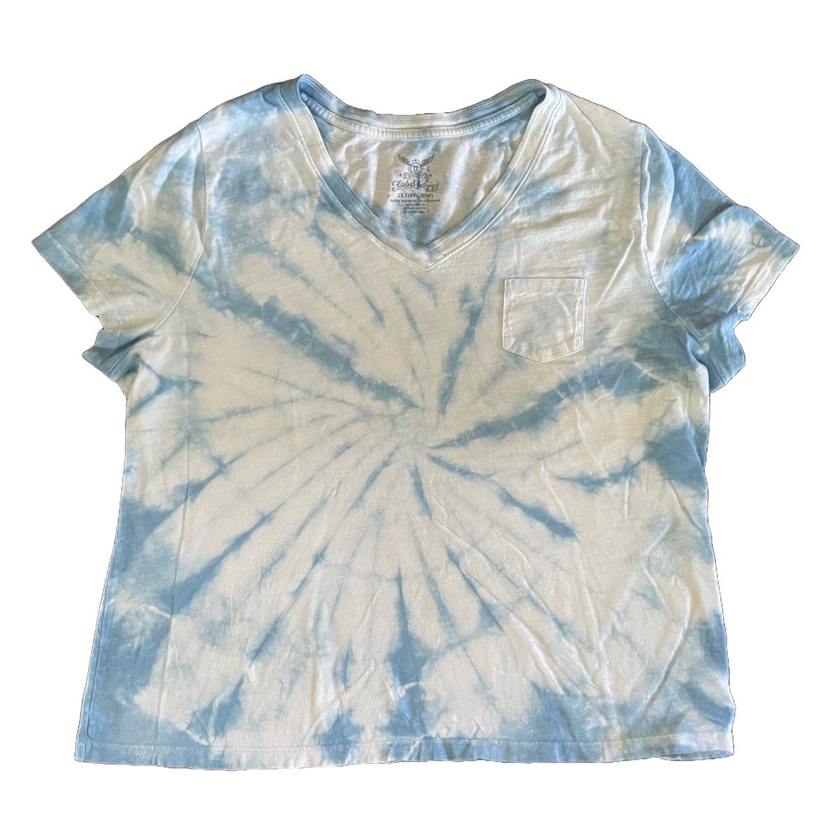 Previously loved Faded Glory cotton V neck tee with small chest pocket and shorter, womens cap-style sleeves. Spiral dyed in a bath of natural indigo.