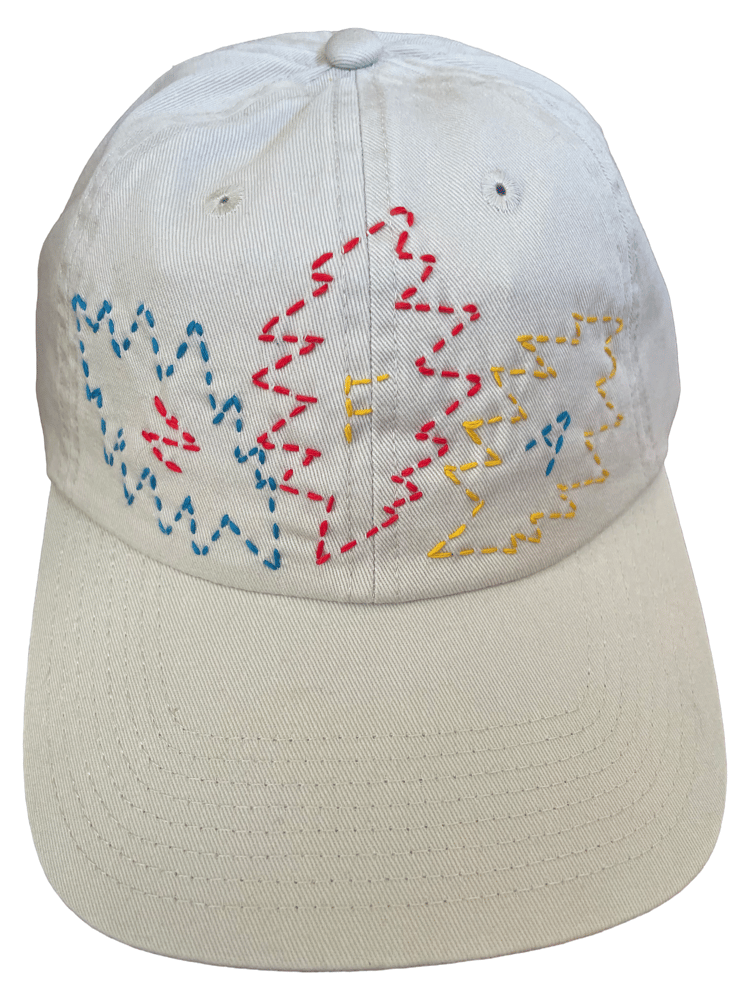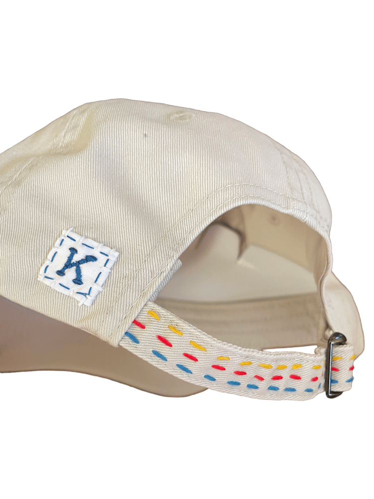Red, yellow, and blue Owsley bolts with contrasting letters. Three stripe embroidered strap. Buckle closure. Hand-sewn “K” tag. New khaki hat.