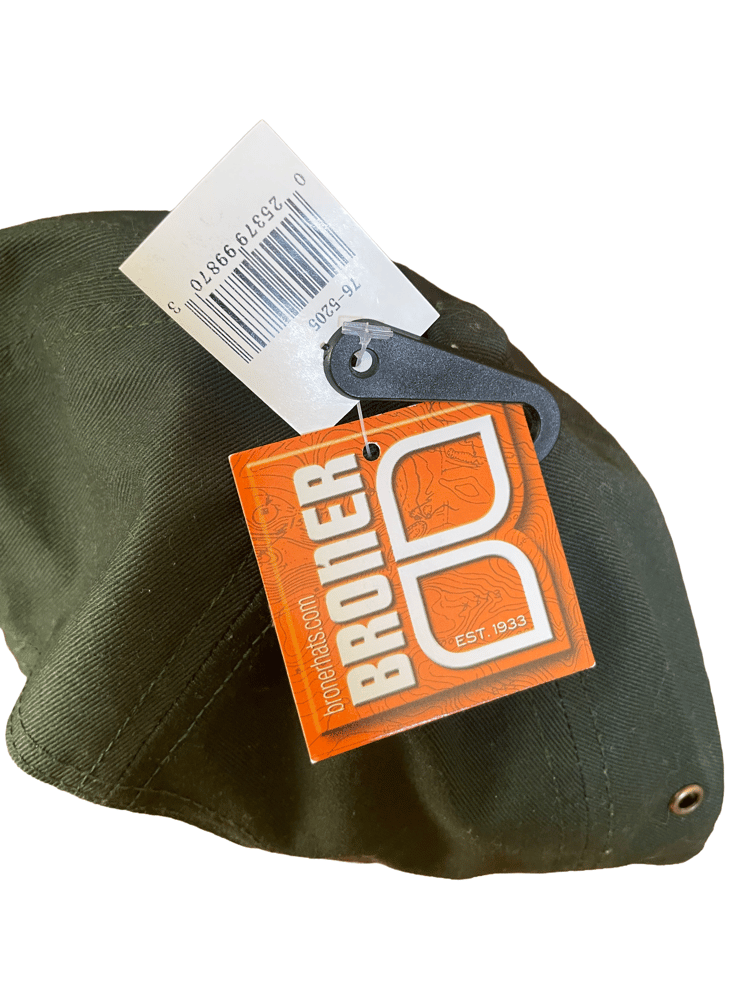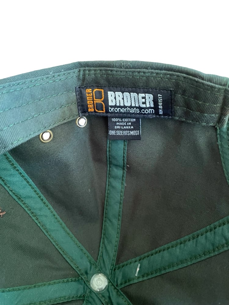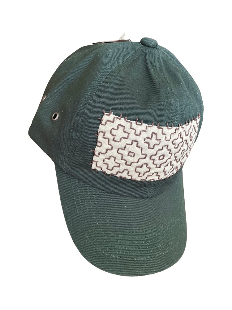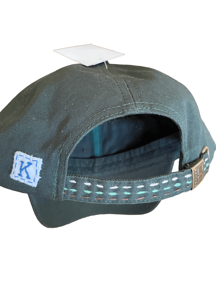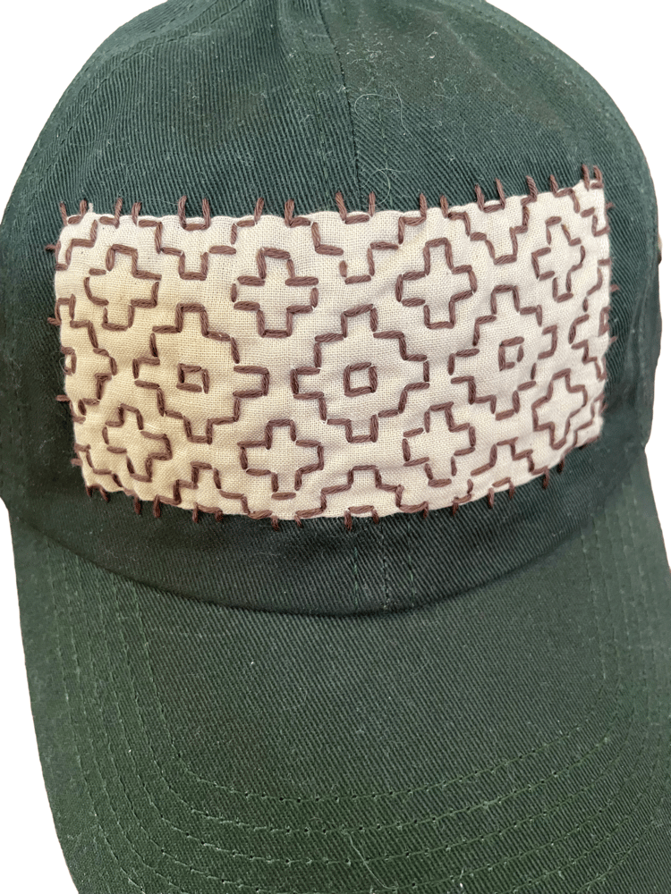 Khaki rectangle, overflowing with persimmon sashiko stitch in brown. Three stripe embroidered strap. Buckle closure. Hand-sewn “K” tag. New forest green hat.