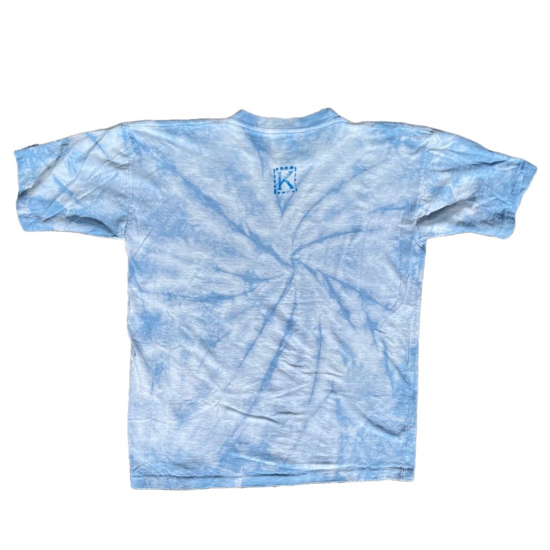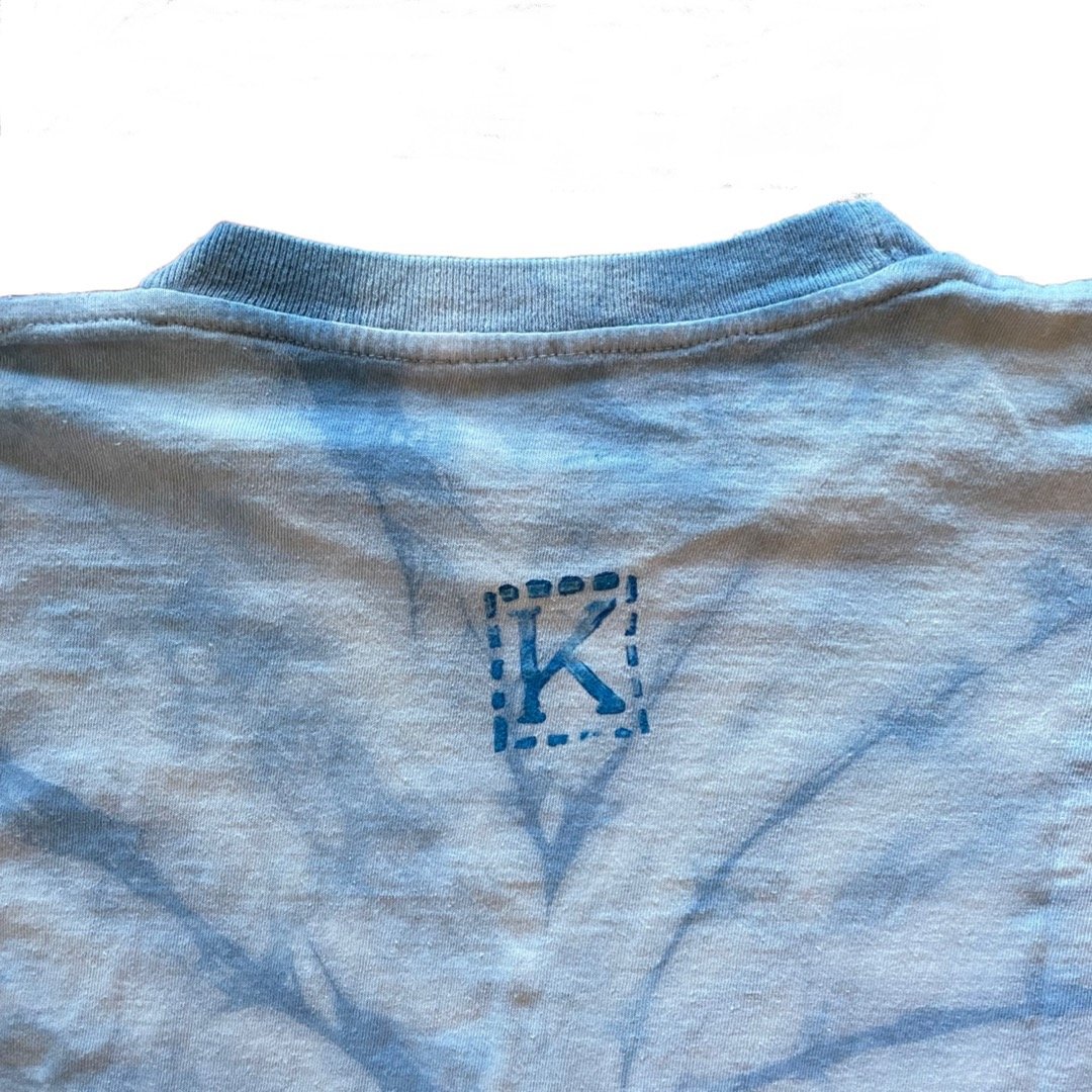 Very soft and broken-in. The print has some fading but overall is in good condition. Hand-dyed in a vat of natural indigo with a spiral pattern. "K" logo stamp added to the rear.