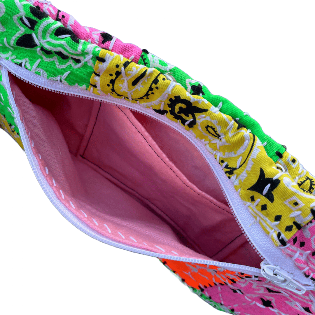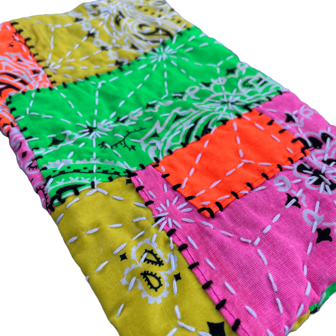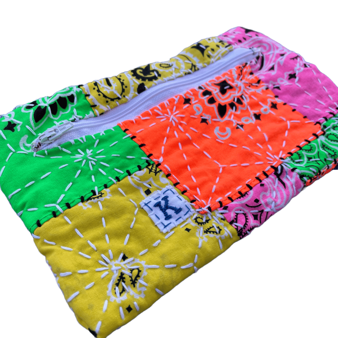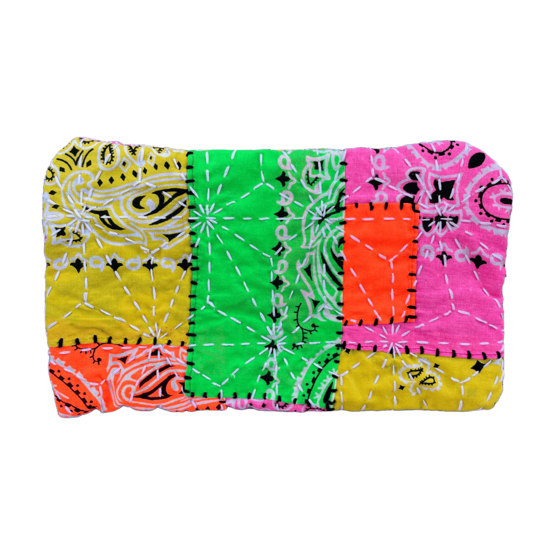 A small zippered carryall in bold neon colors with a quilted texture from hand-sewn patchwork. Reinforced with sashiko stitching in a traditional asanoha pattern.