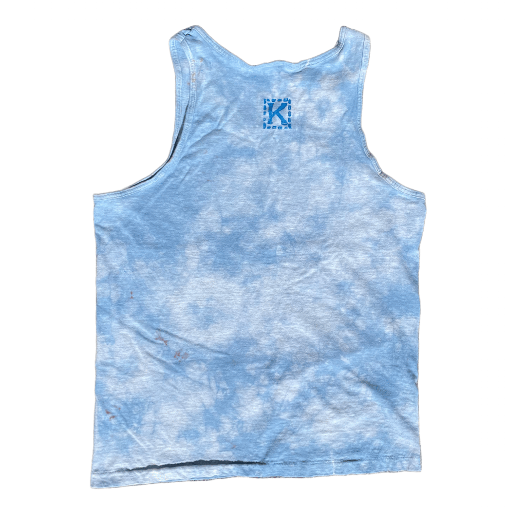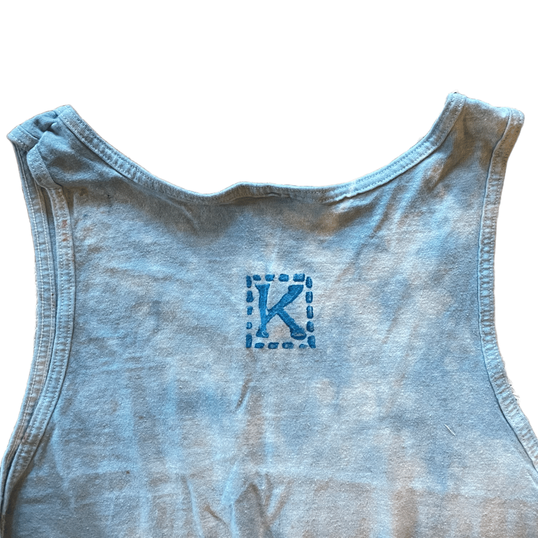 Very soft and broken-in. The print is in excellent condition. Hand-dyed in natural indigo for an undersea swirl. "K" logo stamp added to the rear.
